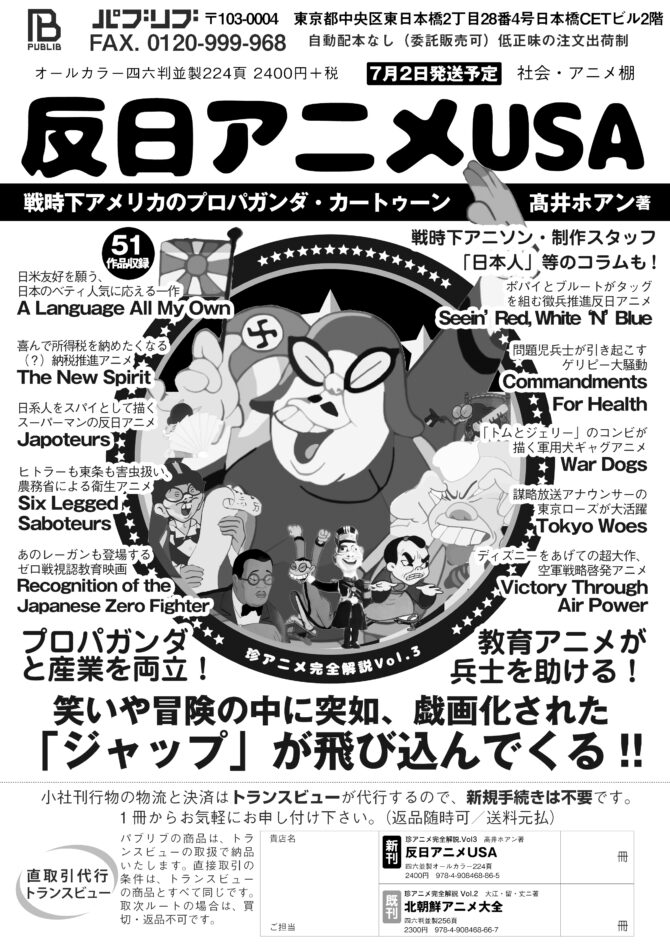 副題は「戦時下アメリカのプロパガンダ・カートゥーン」、シリーズ「珍アニメ完全解説」のVol.3となる。ホアンは同社からシリーズの第一巻となる『鬼畜米英漫画全集』が昨年2月に出版されている。
