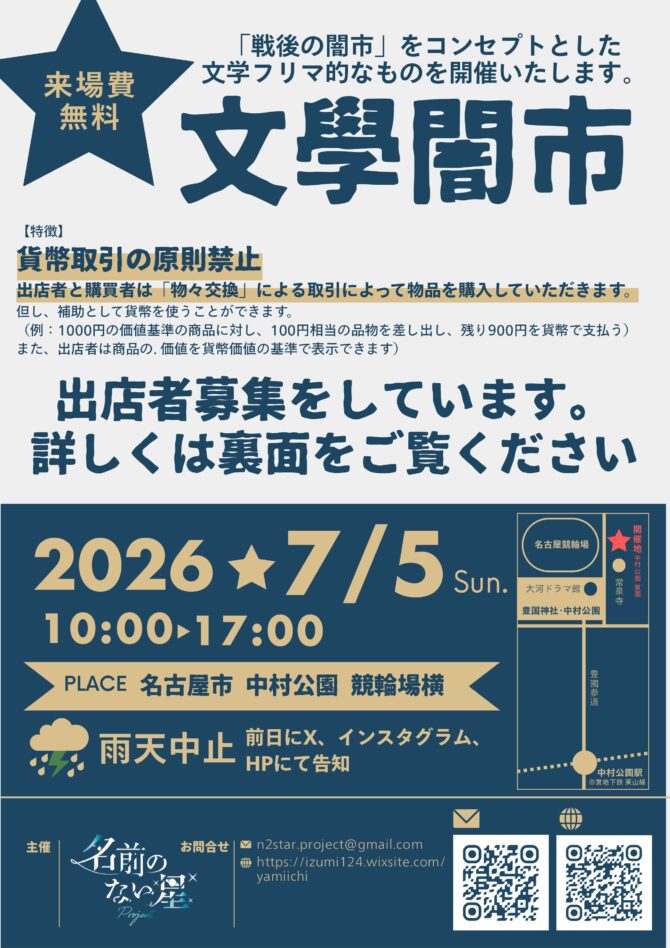 7月5日、名古屋・中村公園で、「名前のない星」プロジェクトの主催による文学フリマイベント「文學闇市」が開催されることがわかった。