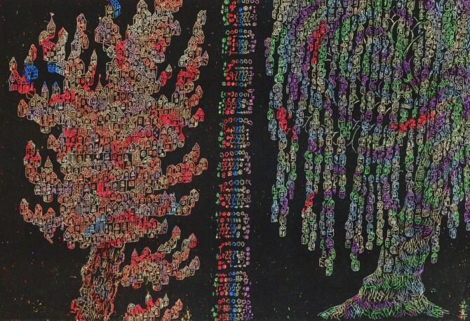――七色のカンバスに、裸の黒人が、無数の円を塗っている。無数の円は、しだいに模様を呈し始める。雨が降り出すと、黒人はしだいに、猫になってゆく。カンバスはなにになってゆくか?……