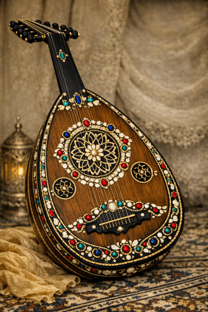 ウードはAIに描いてもらいました。12弦独立しているように描かれてしまったけど、本当は一か所2弦×5と単弦で11本です。